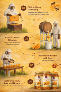 This honey is 100% raw, unprocessed, and free from added sugar, chemicals, or preservatives.